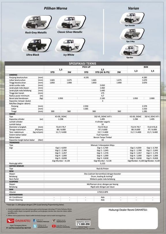 Mesin 1.5L-nya ini bisa ngeluarin tenaga 97 hp di 6.000 rpm dan torsi 134 Nm di 4.400 rpm — cukup kuat buat angkut barang berat atau jalan di tanjakan. Selain bertenaga, konsumsi bahan bakarnya juga irit banget, apalagi dengan teknologi Dual VVT-i yang bikin pembakaran lebih efisien.