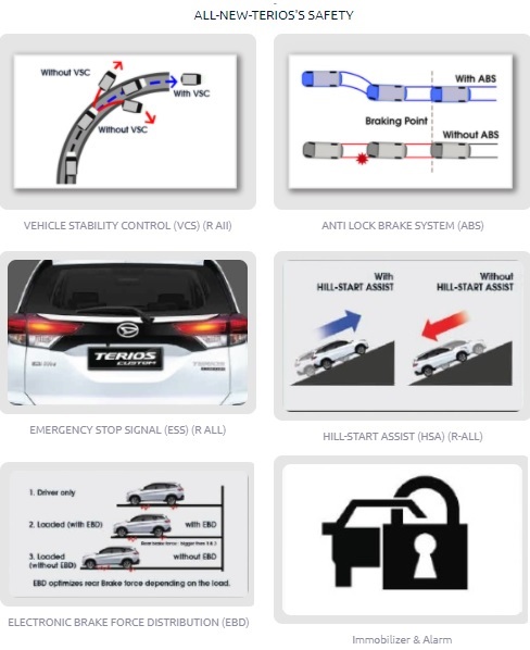 Terios terbaru juga nggak mau kalah soal keamanan. Semua variannya udah dilengkapi Dual SRS Airbag , ABS (Anti-lock Braking System) , EBD (Electronic Brakeforce Distribution) dan Vehicle Stability Control (VSC)